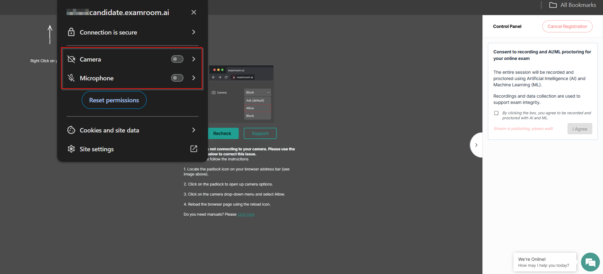 In the control panel, select the checkbox and click IAgree to consent to recording and AI/ML proctoring to support exam integrity.