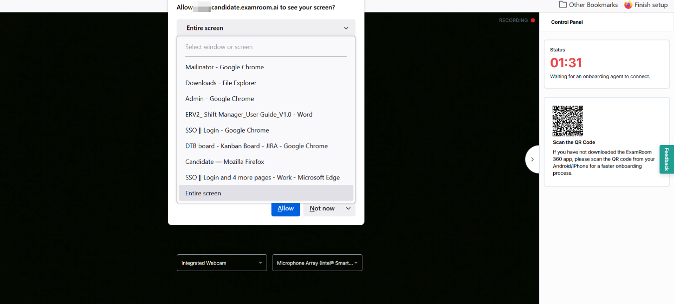 A pop-up for screen sharing appears on the page to share the screen. Select EntireScreen from that drop-down and click Allow to share your screen with the onboarding agent.