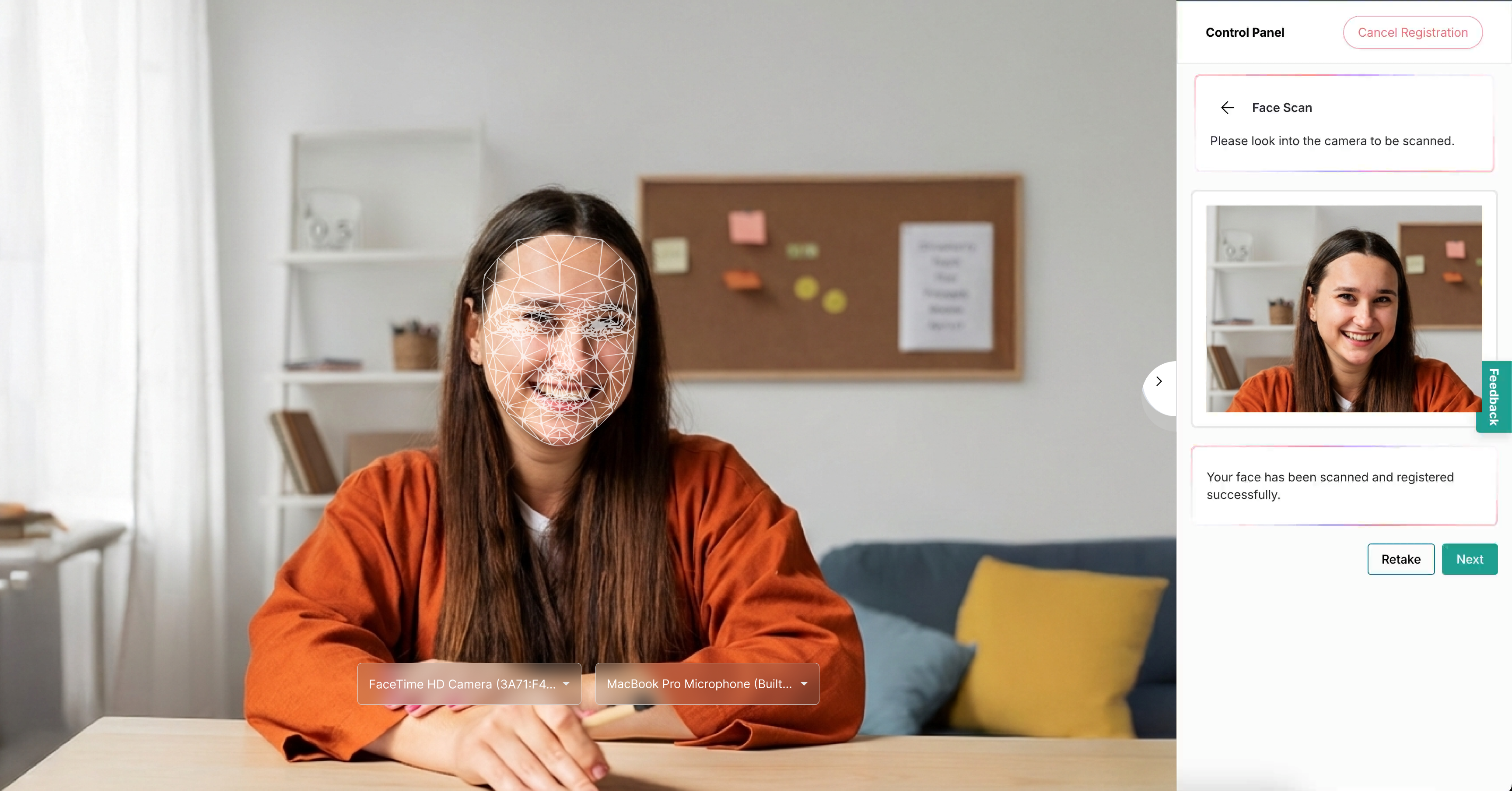 - As your face is automatically captured, a photo will appear in the control panel. If the image looks clear, click Next. If not, click Retake to try again.