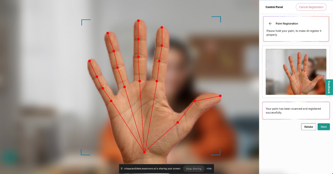 • When the palm scan appears, review the image in the control panel. If it looks clear, click Next. If itโ€™s blurry or unclear, click Retake to try again.