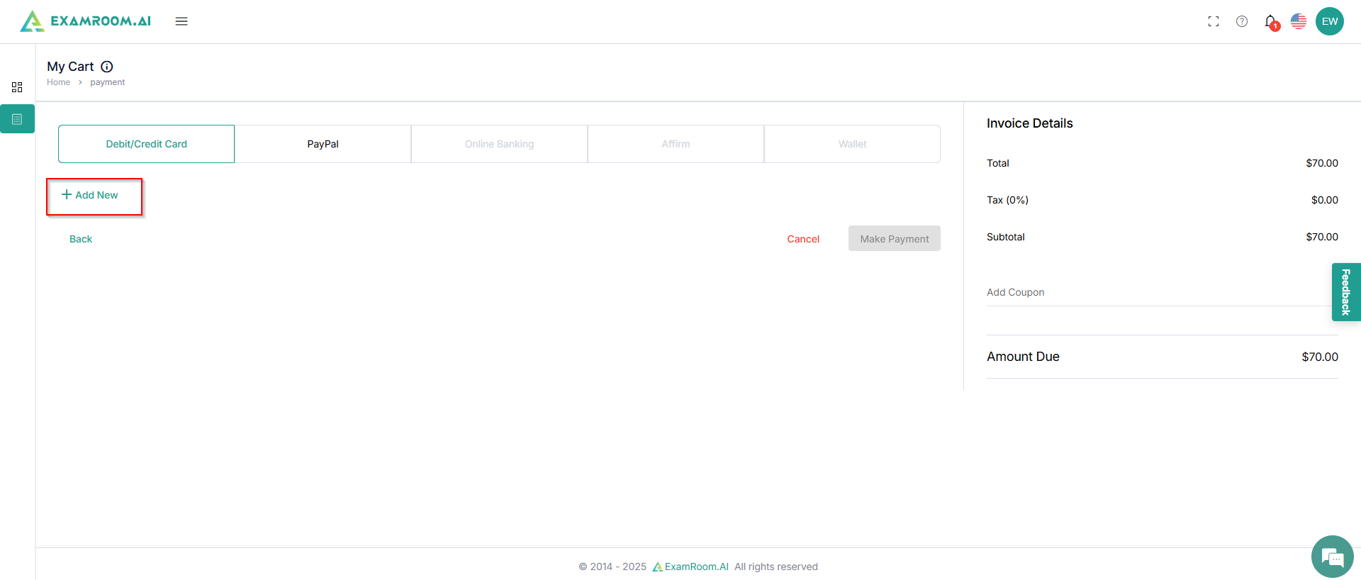 On the next screen, choose your payment method and click +AddNew. For example, here payment method chosen is Debit/Credit Card.