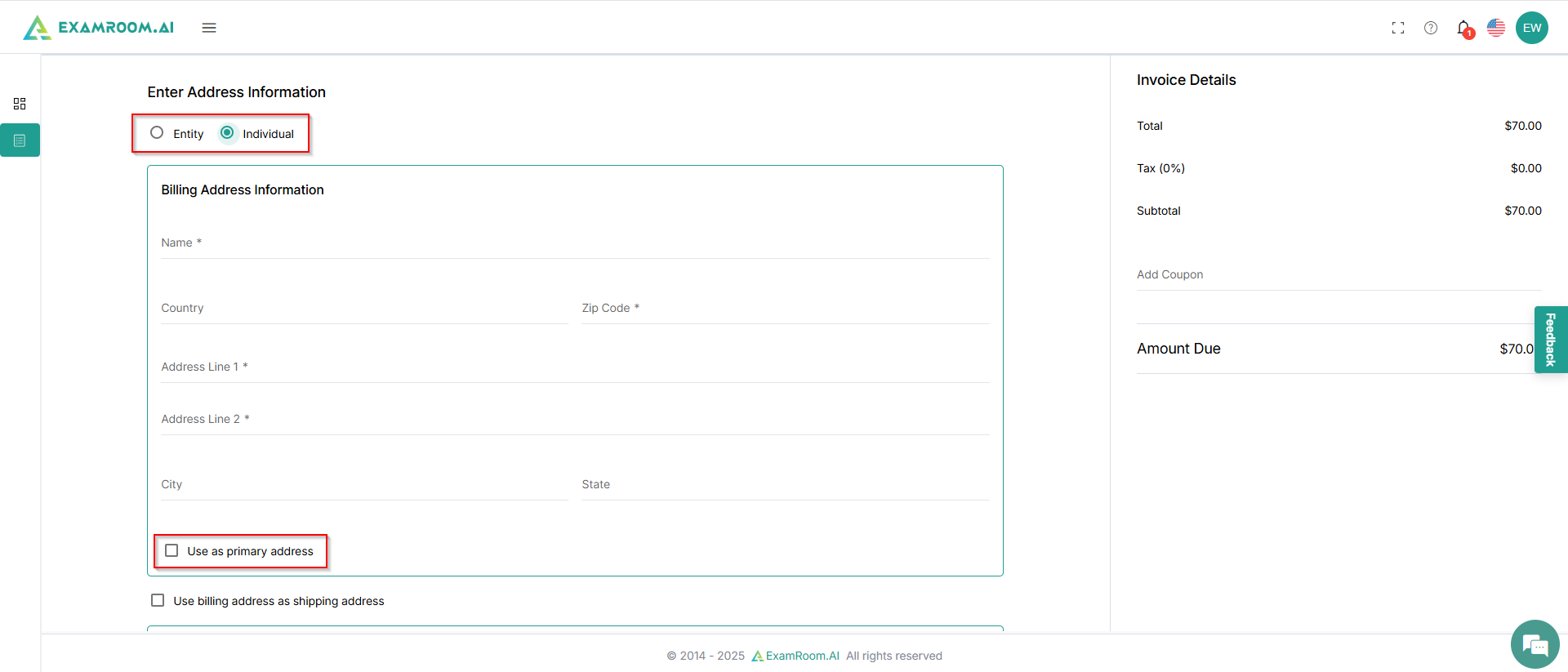 Now, enter the address information. Select from Entity or Individual and fill in your billing address information.