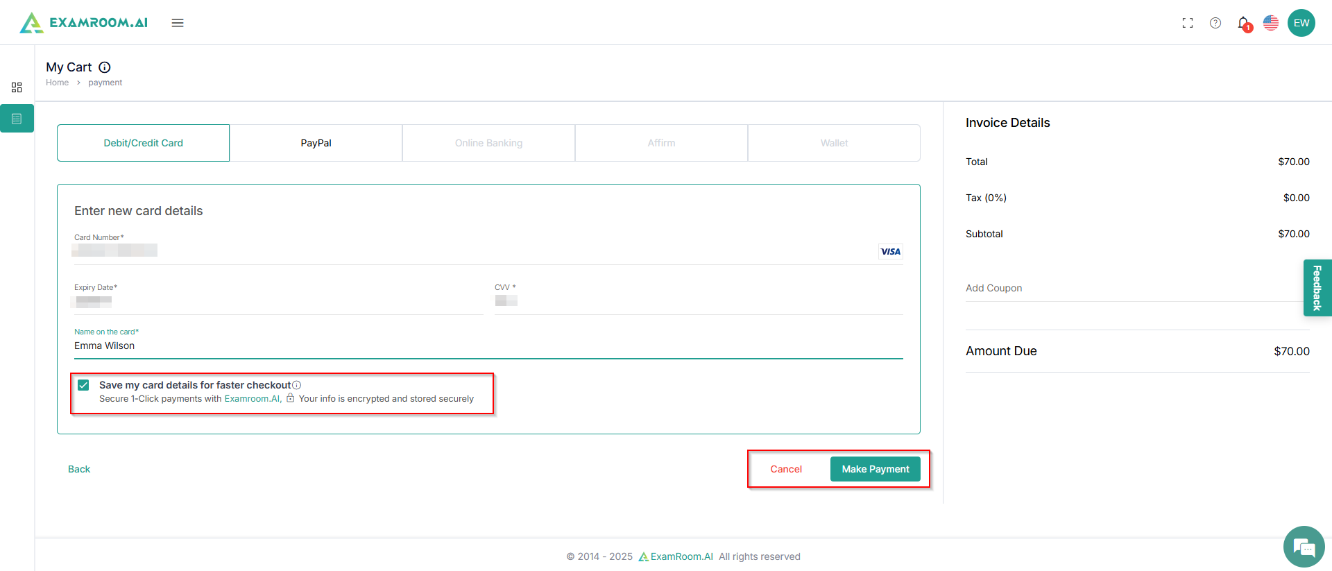 Enter the details and click MakePayment. Select Savemycarddetailsforfastercheckout, if you wish to save your card details securely for faster payment in the future.