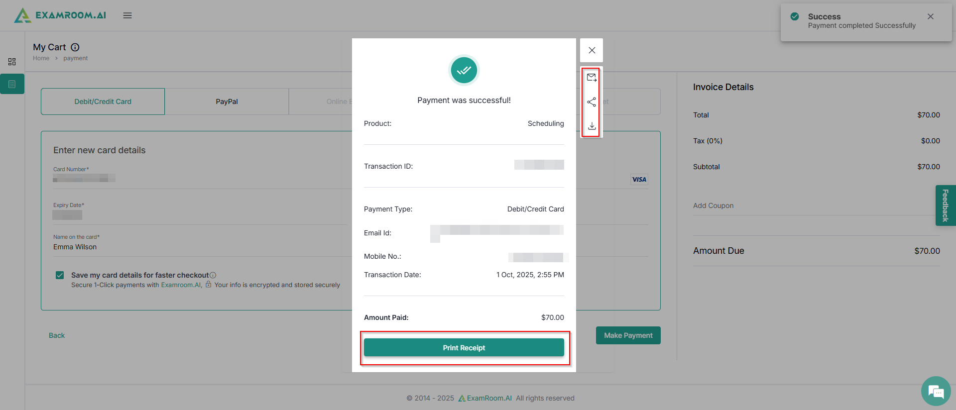 Click PrintReceipt to print the payment receipt, or you can directly send to email, share, or download the receipt.
