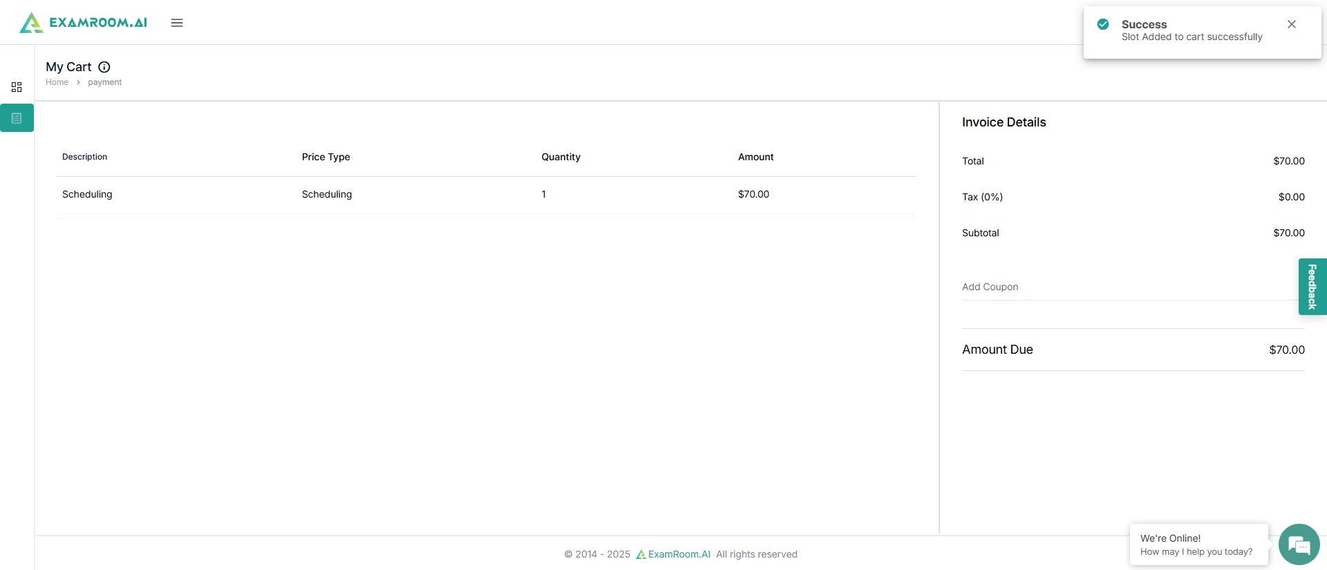 A pop-up on the top right of the screen shows that the exam slot has been added to the cart successfully.