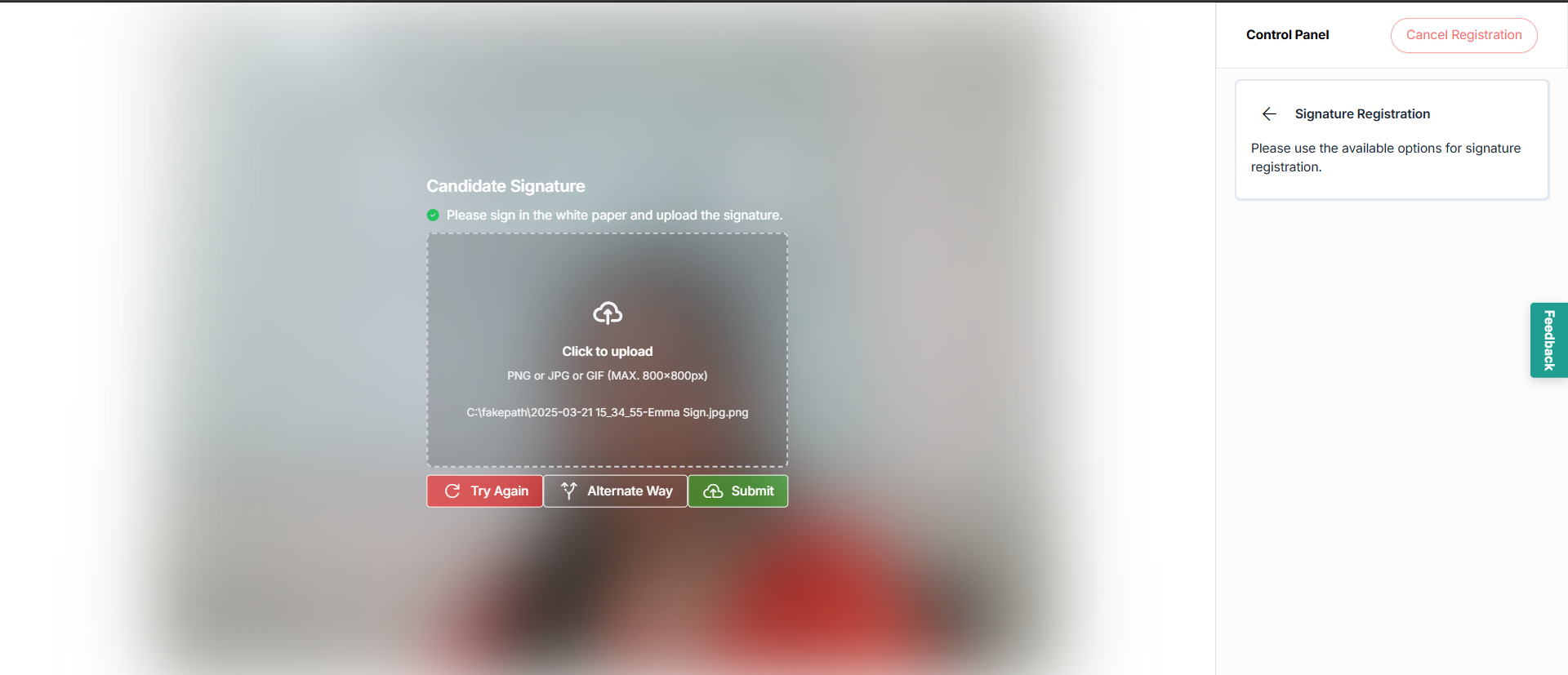 Option2: Sign your name on a white sheet of paper, then upload the image. The acceptable file types are listed on the screen.