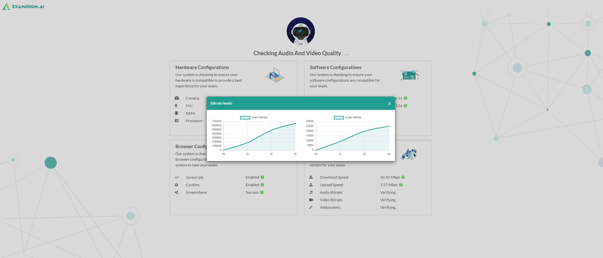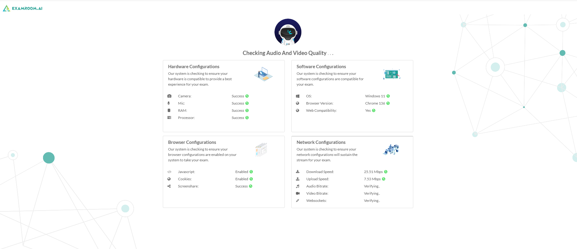 After your camera and device details are saved, a pop-up shows the hardware, software, browser, and network configurations. Ensure every aspect of the configuration check is marked as success for a smooth examination process.
