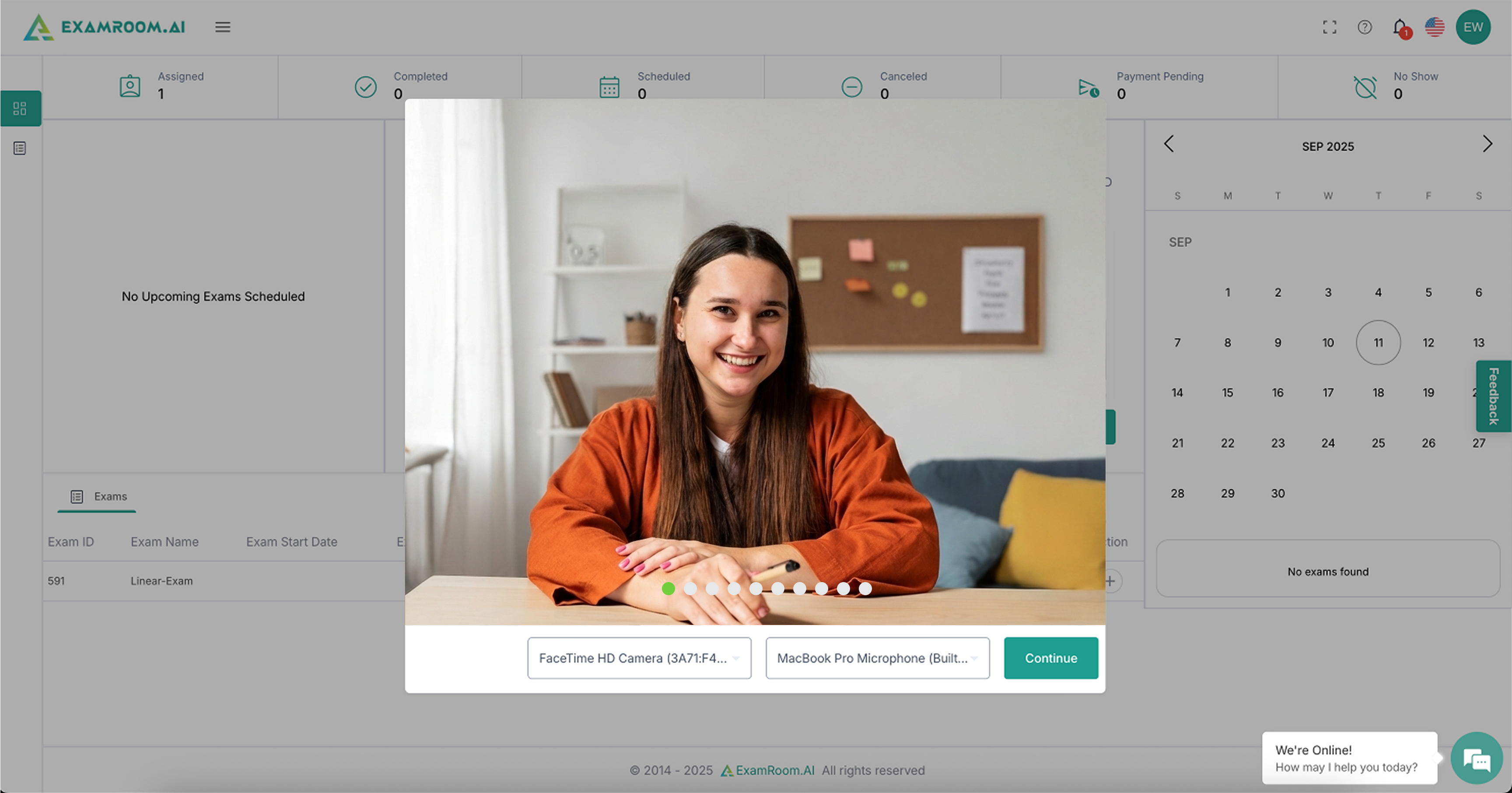 - When you start the system check, your camera and device details are detected, and a live view from the front camera is displayed. Click Continue to move forward. You can also switch your device from the drop-down menu if required.